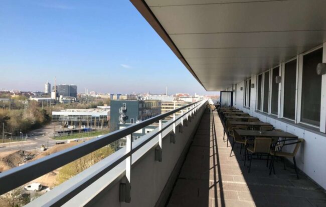 Das absolute Highlight unserer Räumlichkeiten ist die gemeinschaftlich genutzte Dachterrasse. Hier kannst du nicht nur frische Luft schnappen, sondern auch Meetings abhalten oder einfach eine entspannte Pause mit einem einzigartigen Panoramablick auf die Alpen genießen.